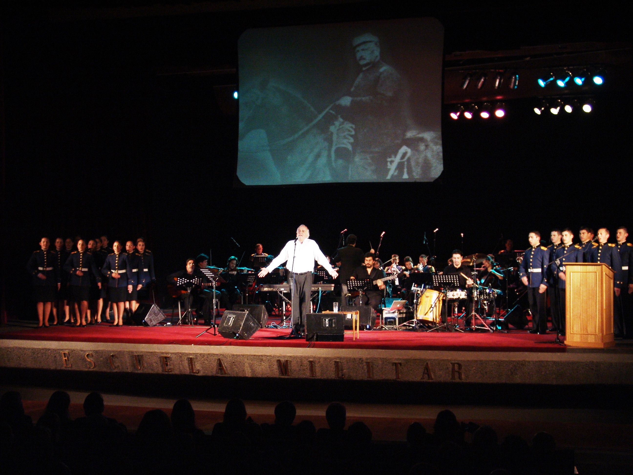 Al 7 de Linea Volumen II, La Nacion en Armas" Esta presentación tuvo como marco la gran Orquesta dirigida por el maestro René Calderón, compuesta por músicos de la sinfónica y la valiosa participación de musicos de la Banda de Concierto del Ejercito y del gran Coro del Escuela Militar, integrado por alumnos y alumnas cadetes. La proyeciónn de hermosos clips alusivos a las canciones con material gráfico de la época de la contienda, contribuyó a crear un ambiente de gran emoción en la audiencia que vibró con cada una de estas canciones . |